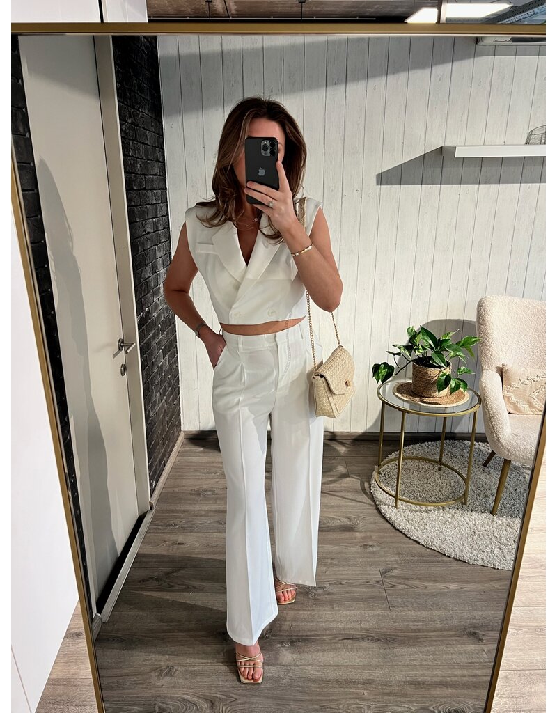 Broek/Pantalon afgewerkt met een rits en knoop. Deze pantalon heeft zakken en heeft een bijpassende korte blazer. Deze kan zowel in kostuum aangekocht worden als afzonderlijk